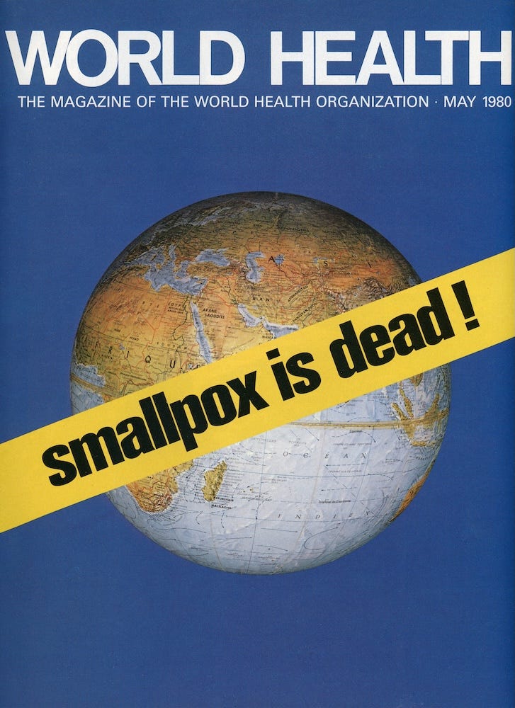 The eradication of smallpox by 1980 was also achieved through innovation: a campaign inspired by a Soviet proposal, backed by American money and expertise, that succeeded because a Brazilian-led World Health Organization provided the platform to sustain a worldwide effort. The return on investment was staggering. The United States spent just $32 million globally on a permanent solution to a disease that had previously cost that much every month, simply to keep smallpox outside of its own borders.